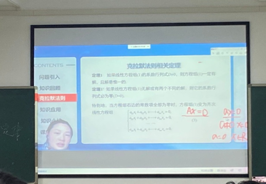 专职组织员贾珍如期来到主教学楼A-108教室,为远在长沙的邱罗老师《线性代数》在线教学做好线下课堂的教学辅助准备工作。