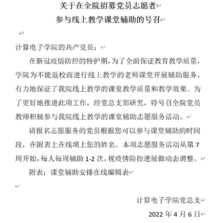 4月6日下午,为更好地为常态化疫情防控下的线上课堂教学质量保驾护航,学院党总支向全院党员发出号召,招募党员教师志愿者参与线上课堂教学辅助工作,得到了广大党员老师的积极响应和热情支持。