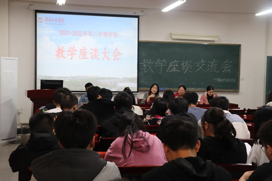 在主教学楼F205举行了2021-2022学年第二学期教学座谈会。会议由主管教学工作的副院长田智鲲主持,教研室主任及教师代表肖刚、容青艳、王祝君、刘兰初、李小青参加,学院全体班长、学习委员作为学生代表参加了此次座谈会。