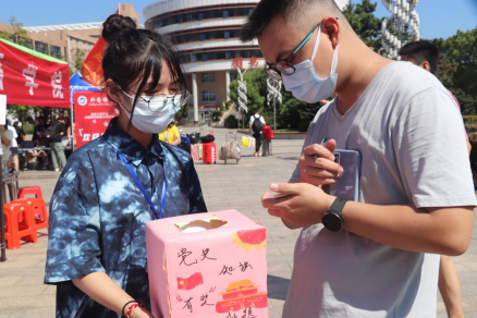 “同学,要不要来一次党史知识有奖抽题?为你们准备了精美的小礼品哦!”由学生党员和”青马青语“宣讲团组成的志愿者们在迎新点热情地询问,吸引了大批感兴趣的新同学,抽题箱前围满了人,新生在党史知识面前大展身手。