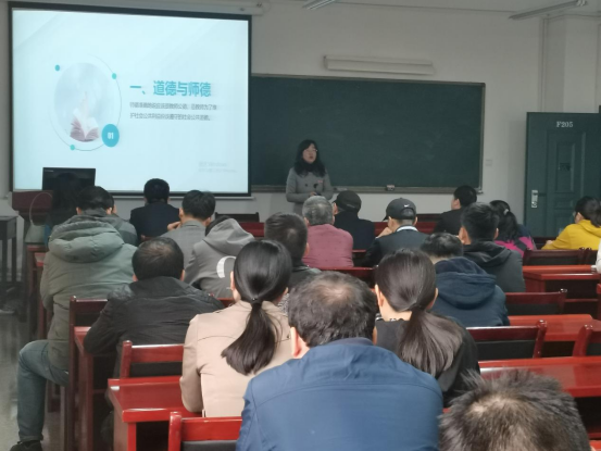 在主教学楼F205会议室组织师德师风建设专题学习,党总支部书记贾珍为全体教职工作了《坚持立德树人争做“四有”好老师》的专题讲座。