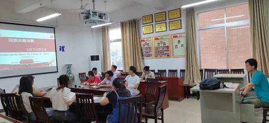 教工第一党支部在G207组织全体党员上党课,学习关于《中国共产党党徽党旗条例》和国旗国徽国歌的基本知识。