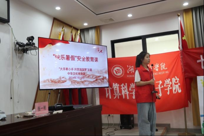 “大手牵小手 共筑强国梦”中华文化传承社会实践团的成员来到湘潭市盘龙社区开展了“快乐暑假”安全教育课,旨在引导小朋友们从小树立正确的安全观念和行为习惯,预防安全隐患。
