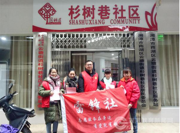 雷锋社志愿者每年还会前往社区开展志愿服务,协助社区工作人员开展社区建设工作,从2016年开始正式和湘潭市雨湖区杉树巷社区建立了社区志愿服务协议,两年期间,志愿者们利用课余时间和社区工作人员一起开展防诈骗、创建森林城市等入户宣传工作,为帮助社区建设以及居民环境提升,倾注了自己的志愿服务热情。