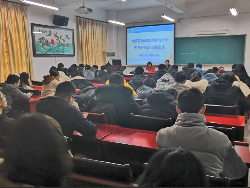 2月26日中午,理学院于教学楼主楼F205开展了2016级考研动员大会暨考研基地入驻仪式。此次会议由辅导员蒋淑亚主持,理学院党总支副书记陈亚琼及2016级考研的同学参加了此次活动。