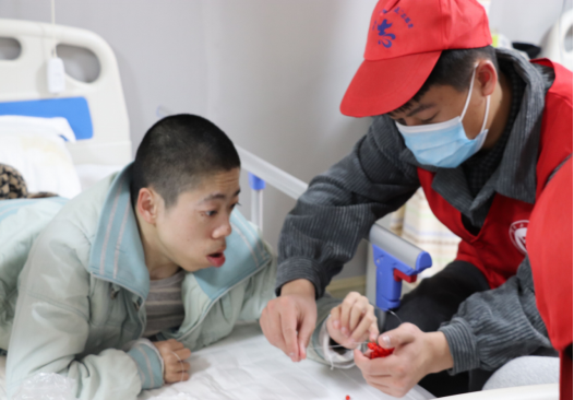 做康复治疗,志愿者们还陪同他们一起在病房里同病魔勇敢地作斗争。
