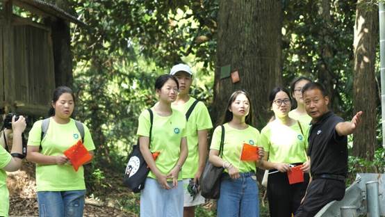 图为马鞍镇相见村村委会书记龙成发为实践团成员讲解贡田古树林群的历史。文泷 摄