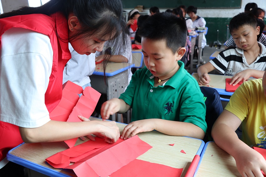 图为实践团成员上“红红的中国年”主题剪纸课 龚艳星 摄