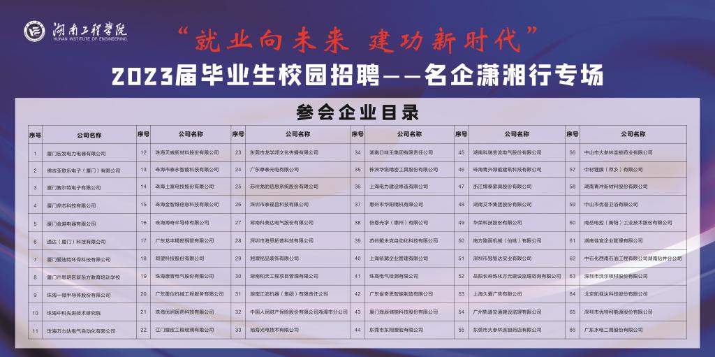 (3月3日)14:30,在新校区机械楼大厅将举办“就业向未来 建功新时代”2023届毕业生校园招聘--名企潇湘行专场,参会企业66家,来自广东、福建、浙江、湖南等省市,请19级毕业生积极参加。