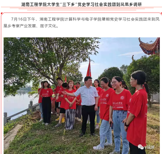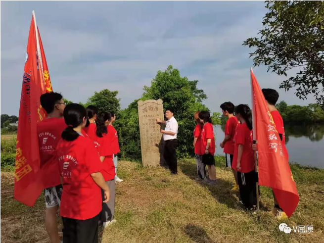 接着实践团来到河泊潭村,走进屈原投江殉国之地——河泊潭,听村级负责人介绍屈原的生平事迹、在河泊潭生活的故事,听凤凰乡主要负责人介绍河泊潭怀沙亭碑石的由来,汨罗江诞生于河泊潭的历史渊源,缅怀伟大爱国诗人,感受深厚的屈子文化。