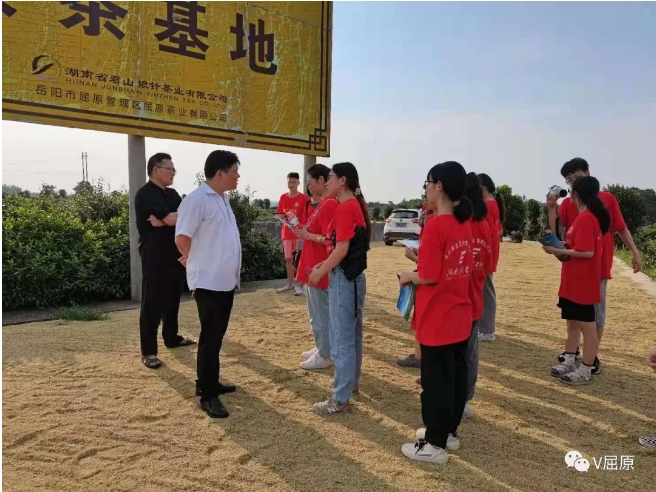 最后实践团来到凤凰山黄茶基地,一下车看到广袤的茶叶种植基地,大学生们不时的惊叹,对茶园兴趣颇大,认真地倾听、了解凤凰山茶产业发展的历史、茶文化、茶品种等。