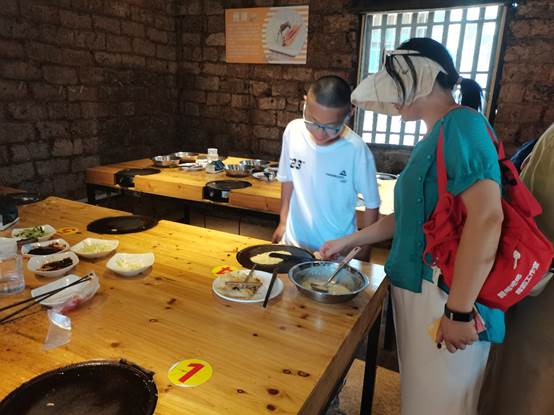 在煎饼坊里,邱罗老师从容地将细面子调成糊状、用木片将面糊摊开刮匀、从边缘铲起翻转加热……手法娴熟、口味上乘,她击败其他5位竞争者,成为“煎饼王”。
