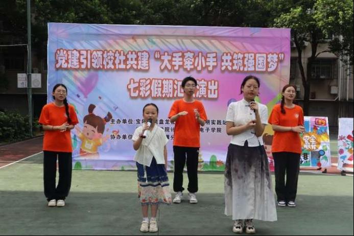 “大手牵小手 共筑强国梦”中华文化传承社会实践团联合盘龙社区在社区开展党建引领校社共建“大手牵小手 共筑强国梦”七彩假期汇报演出。