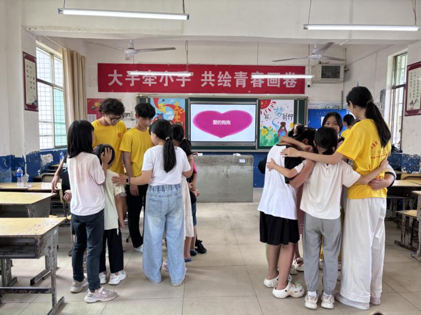 开班伊始,为融化初识的薄冰,实践团成员李琦便精心组织孩子们投入一系列妙趣横生的破冰游戏。在“趣味自我介绍”环节,孩子们不再只简单报上名字,而是在实践团成员的鼓励下,用喜欢的颜色、动物甚至一个有趣的动作来描绘自己。童言稚语间,一张张陌生的小脸开始绽放出独特的个性光彩;在“爱的抱抱”环节,随着指令变换,教室内孩子们笑着、跑着,寻找伙伴完成任务指令。羞涩在奔跑中消散,肢体接触传递着最初的友善与接纳,简单的拥抱成为打破距离感最直接的魔法;在“你写我猜”环节,孩子们分组协作,在背后用手指画出汉字的一撇一捺,揭晓答案后的恍然大悟与回答正确的欢呼交织在一起,团队合作的默契悄然萌芽。轻松愉快的互动瞬间消融了初识的拘谨,为彼此的了解与情感的升温搭建了坚实的桥梁。