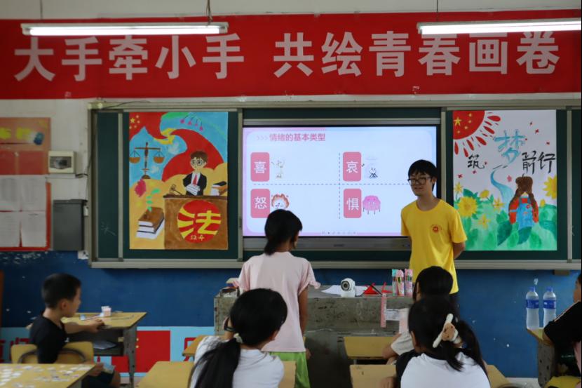活动首日,一场关于“心”的探索在心理教育课启程。“小老师”化身领航员,以寓教于乐的课件为舟,载着孩子们驶入情绪的海洋。实践团成员董豫奇循序渐进地引导孩子们认识情绪的“面孔”,通过生动有趣的卡通表情、情境故事和互动小测验让孩子们清晰地“看见”情绪;辨识情绪的“信号”,启发孩子们察觉身体的“语言”,学会倾听自己身体发出的“情绪密码”;学习与情绪“做朋友”,实践团成员说道:“每一种情绪都是我们内心的信使,没有好坏之分,我们要学会接纳而非抗拒”。实践团成员带领孩子们在模拟情境中练习深呼吸,领悟着“与情绪对话”而非“被情绪掌控”的智慧。