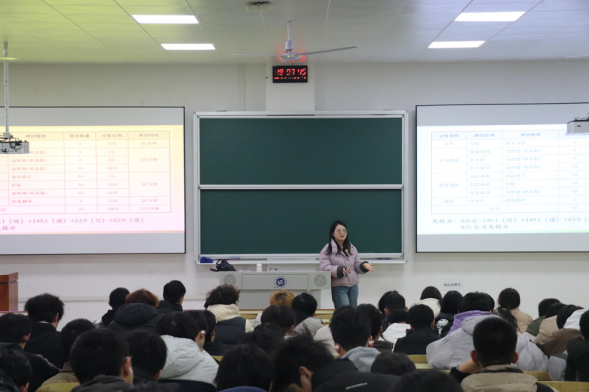 学子精准掌握大学生英语四级考试核心要点,有效突破备考瓶颈,12月8日晚,由学院学生工作办公室组织的“直击考点,决胜四级”考前专题讲座,在主校区教学主楼D102顺利举行。本次讲座特邀资深英语讲师纪芬主讲,学院众多四级备考学子踊跃到场参与,现场学习氛围浓厚。