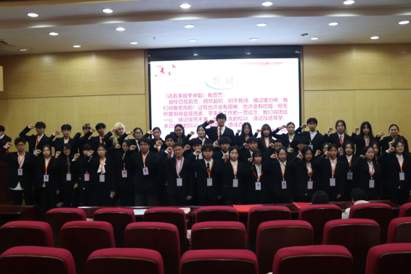 在全场师生的共同见证下,一场意义非凡的交接仪式顺利进行。上一届干部代表将象征责任与使命的旗帜郑重传递给新任干部,这一握既是过往的总结,更是新程的开启。新任干部代表登台宣誓,“团结一心、乘风破浪、勇往直前”的铿锵誓言响彻会场,彰显着他们践行服务初心、勇担时代重任的坚定决心。