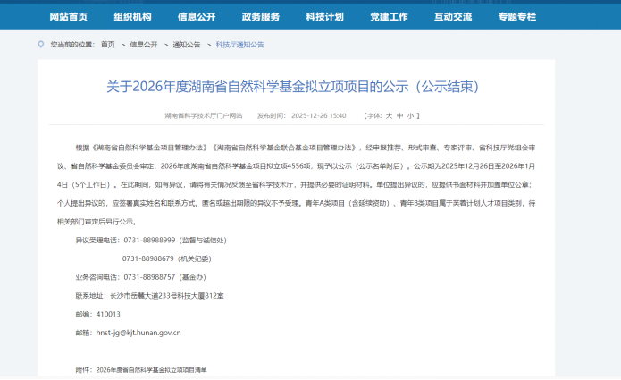 近日,从湖南省科技厅传来喜讯,我院在2026年度湖南省自然科学基金项目评审中取得里程碑式成就。根据省科技厅公布的立项结果,学院本年度共获批项目9项,立项数量与资助经费总额均创学院历史最高纪录,标志着其基础科学研究实力与原始创新能力迈上新台阶,为学校“十五五”科研发展规划目标的实现注入了强劲动力。